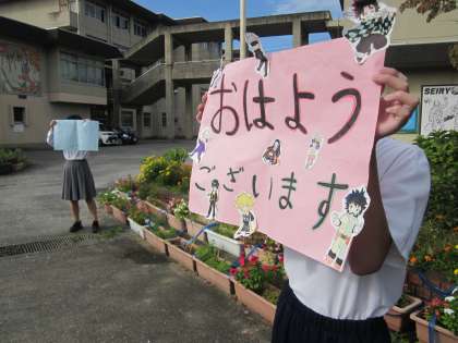 朝の挨拶運動の様子です。評議員が挨拶をしています。授業開始時には,ベル着点検や服装点検も行っています。元気に挨拶ができ,時間を守り,正しい標準服の着こなしができる西陵中学生を目指します。評議員の皆さん,ありがとう。活動は10日まで続きます。