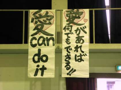 22日と来週の月曜日26日の2日間は西陵祭<文化の部>です。その1日目開始前の体育館を覗きました。2階ギャラリーから垂れ下がっているスローガン「愛 can do it」がありました。「愛」がテーマ。クラス一人ひとりが気持ちを重ね合わせようとする学級の「愛」。その「愛」から生まれる合唱や学年劇、そしてそれら一つひとつから築き上げられる西陵祭。今、8時過ぎ。校舎から合唱練習の歌声が・・・。この西陵祭で「愛」の思い出をつくってほしいと思います。檀上では今日予定している舞台鑑賞で演じていただく劇団の方々の準備が行われていました。今日の予定は舞台鑑賞、展示発表、合唱コンクールの3本立てです。多くの方々のご来校をお待ちしています。