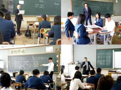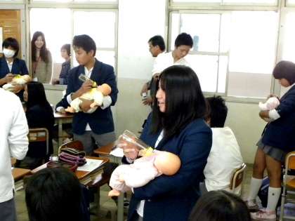 昨日4日に高校の先生方をお呼びして授業体験を5限にしていただきました。高校からは京都西山高校(保育)、京都成章高校(数学)、京都明徳高校(国語)、京都光華高校(数学)、京都学園高校(英語)に来ていただきました。西山高校の保育では実際の赤ちゃんの大きさと重さの人形を扱う実習でした。生徒男女を問わず楽しみながらも、少し慣れない手つきで「だっこ」してミルクを飲ませる姿に将来の自分自身を重ねた生徒がいたのではないでしょうか。赤ちゃんが生まれるまでの先生の話を男女ともにしっかり聞いていたのが印象的でした。他ではグループ学習を取り入れられた授業もあって活動的な授業もありました。