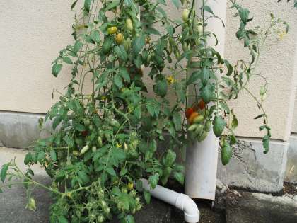 3年生が昨年2年時に育てたミニトマト(アイコ)。その種子が,なぜか校舎の壁のわずかなすきまに入り込んで,発芽し大きく育っています。水も肥料も施してないのに自力で生きています。その生命力に感動します。「どんな状況であっても逞しく生きていこう!」とエールを送ってくれているようです。100個ほど実をつけています。