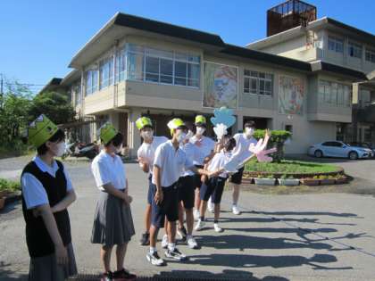 生活習慣を見直す取組の様子です。校門付近では,生徒会本部と評議員が朝の挨拶をしています。グッズも活用し,ベル着や服装点検の声かけをしています。晴天の中,元気にかつ楽しそうに活動しているのが印象的でした。脇では,環境委員による花壇の手入れも行われていました。皆さん,ありがとう。