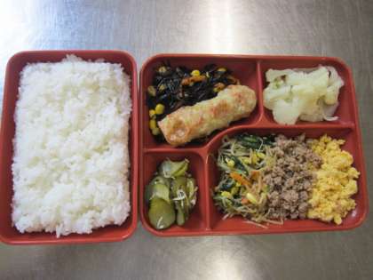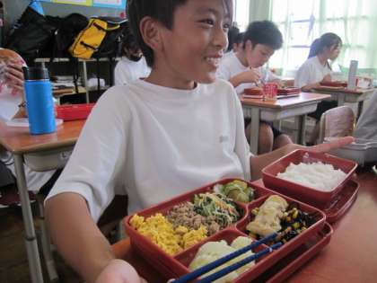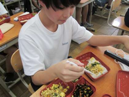 本日の給食メニューはビビンバです。毎日の健康づくりに必要な野菜の量は1日350g以上と言われています。この1食で160gの野菜を摂取できます。1年生が照れながらも撮影に応じてくれました。「食べるから活動できる。活動するからまた食べる。」の繰り返しが理想です。しっかり食べて、充実した1日を過ごしましょう。