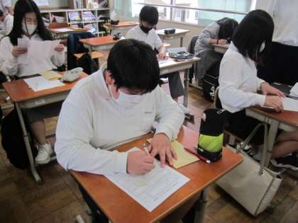2年生が、生き方探究・チャレンジ体験にむけて、エントリーシート(履歴書)の作成に取り組んでいます。初めての経験で、どこに何を記入するのか、思った以上に大変だったようです。何事も経験を積んでの成長ですね。ひとまわりもふたまわりも大きくなってください。体験は、11月8日(火)〜11日(金)を予定しています。