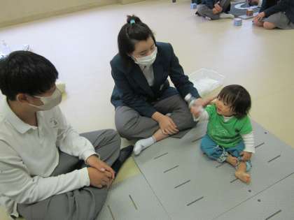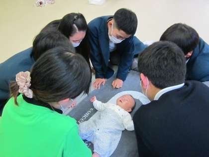 実際に目の前で乳幼児の観察を行ったり、乳幼児の保護者の方からのお話を聞いたりすることで、乳幼児の身体や心の発達、生活習慣、遊びなどについての課題解決学習を行いました。