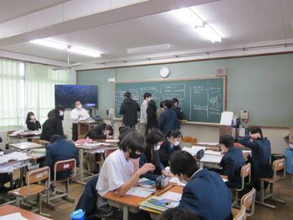 理科の様子です。与えられた課題に対して、グループで意見を出し合い、考えた内容を全員で共有するために、黒板に書きに来ているところです。定期テスト1週間前になりました。一生懸命、コツコツと学習に取り組んでいきましょう。