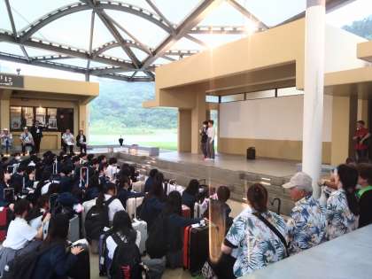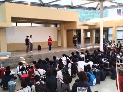 入村式が始まりました。民泊先の方のあたたかいお出迎えで、緊張も緩んだ人が多いようです。