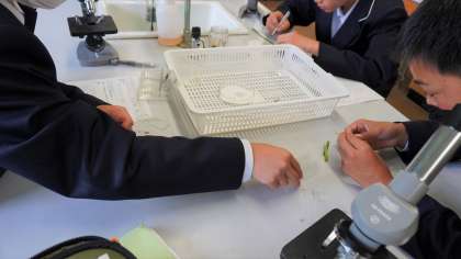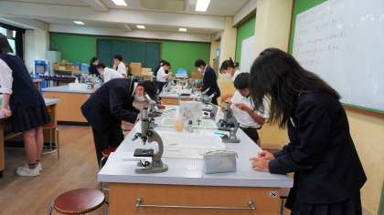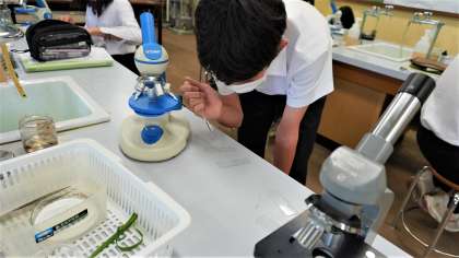 2年1組は理科の学習で、ニラの細胞と自分の頬の細胞を顕微鏡で観察し、違いを見つけていました。