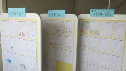 3年生のフロアには、テストに向けての掲示や修学旅行のまとめを英語で綴った掲示がありました。