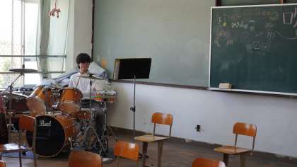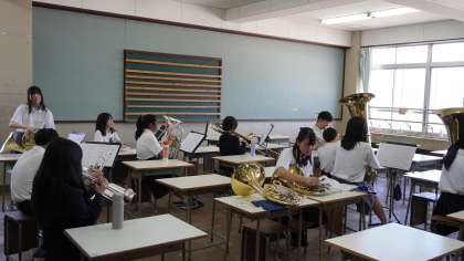 吹奏楽部はエアコンの効く部屋に分かれて練習中。