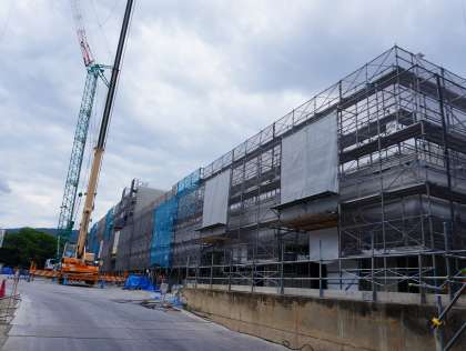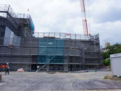 工事が進み、一階には窓ガラスが取り付けられていました。