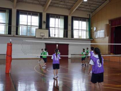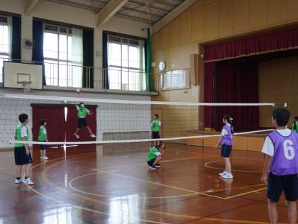 サーブも入ってレシーブする姿も見られます。めあてを確認しながら学習を進めています。