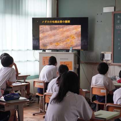 血管のつくりと働きについて学んでいます。モニターに映ったメダカの血管の様子を観察しながら、はたらきについて学習しています。