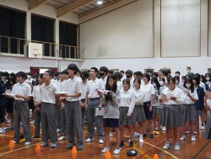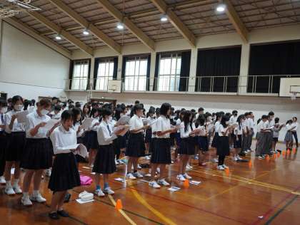 西陵祭文化の部で行う全校合唱の練習を、体育館に集まって初めて全校で合わせました。