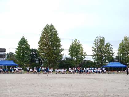 生徒集合も終わり、各クラスで朝学活を運動場で行っています。