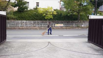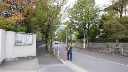 毎朝、管理用務員さんが正門前の落ち葉を掃除してくれています。