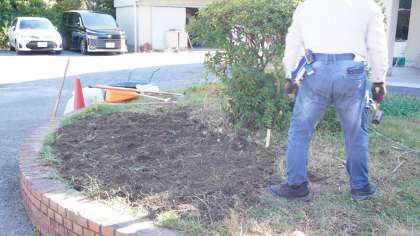 正門前の花壇のコスモスも花が散り始めたので、次の花の植付けに向けて管理用務員さんが耕してくれています。