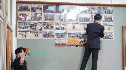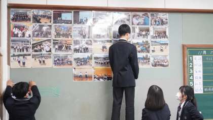 放課後の2年1組の教室では、後ろの掲示板に掲示物を貼っているところでした。