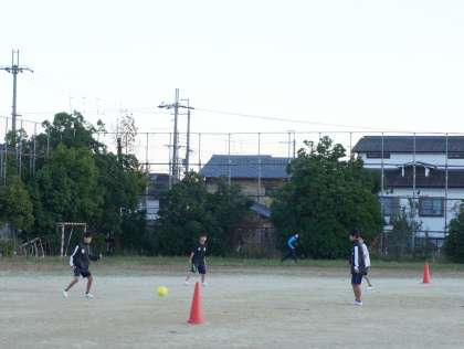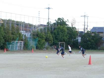サッカー部はパスをつないでシュートまでの練習をしています。