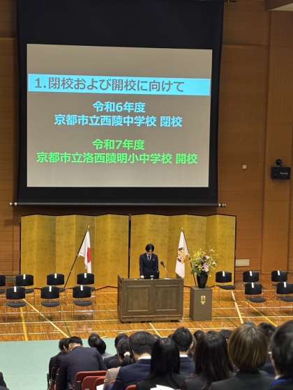 西陵中からも表彰を受けた教員がおり、さらに代表として、本校の現在の取組や洛西陵明小中学校に向けての取組について発表をさせていただきました。
