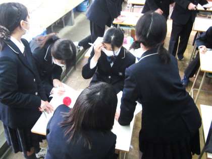 美術の授業では、自然物を粘土で制作し、工夫や難しかった点について振り返りを各自で行っていました。