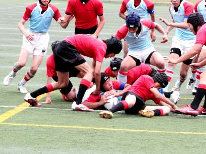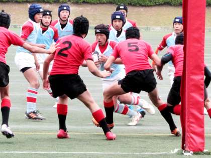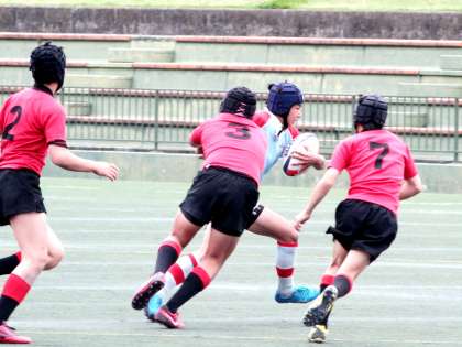 5月20日の日曜日、宝ケ池球技場で準決勝が行われました。対戦相手は新人戦優勝の伏見中学校。両チームとも積極的に攻めるも硬いディフェンスで0対0のまま折り返すかと思われた終了間際、伏見中が外へ展開しトライ。7−0のビハインドで前半が終了しました。後半に入り風上にたった西陵中も効果的なキックで地域をとり、ペナルティーからフォワードが突進してようやくトライ。ゴールキックも決め7対7と追いつき、その後は一進一退の激しい攻防が続きました。試合時間も押し迫ってきて、引き分け抽選かと思われたロスタイムに西陵のキックが相手ゴール前へ迫り、相手選手が飛び込んで処理しようとしたボールをこぼしたところ、すかさず西陵がトライ!!。ゴールも決め14−7で大接戦を勝利しました。どちらが勝っていてもおかしくない集中力を見せた両チームの選手に大きな拍手が送られました。決勝戦は5月27日(日)西京極競技場で行われる京都ラグビー祭でvs洛南中11:20キックオフで行われます。2年前のラグビー祭も洛南中と対戦でした。その時は大雨の中、洛南中の壁があつく力負けしまたことが思い出されます。今回も修学学旅行があって十分に練習が積めませんが、先輩たちの思いも併せて臨み勝利してくれることを祈っています。目指せ!!優勝。