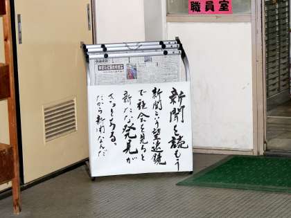 6月1日から職員室前に新聞架を設置し3紙(朝日新聞、毎日新聞、京都新聞)を吊るしています。これはNIE(教育に新聞を)の取組の一つで、一人でも多くの生徒に新聞を読んでもらうことを願うものです。この1年間に前記3紙の他に読売新聞、日経新聞、産経新聞も予定しています。月ごとに吊るす新聞を変える予定ですので是非とも新聞を手にし記事一つでも目を通してくれたらと願っています。