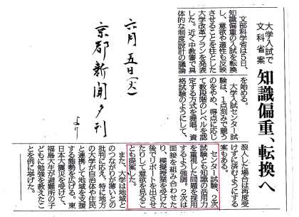 6月5日(火)の京都新聞夕刊に「大学入試で文部科学省 知識偏重、転換へ」という記事が載っていました。新学習指導要領をうけてのことかと推察しますが、今回の大学改革プランが実行されると高校はその対策に迫られるでしょうし、具体的には授業の在り方が変わるんではないかと思います。そうなれば中学校の教育活動にもこれまで以上に影響をおよぼしてくるのではないでしょうか。「知識活用の重視」にむけた入試や入学検査に対応する授業ではこれまでの一斉講義型では限界があります。生徒の活動を組み入れた授業等の構築による学力形成がより必要になってくるのではないかと思います。その必要性が大学入試の改革プランでこれまで以上に現実味を帯びてきたように感じます。