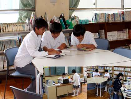 図書室にある新刊を含めた書物の紹介について、生徒の作成したポスター等でこれまで図書館の廊下側にある窓ガラスに貼り付けて生徒に知らせてきましたが、このたび掲示板を用務員さんに製作してもらい取り付け作業までしていただきました(画像上)。今年の4月から図書館教育支援員の方を京都市教育委員会から1名配置していただきました。掲示板で図書の紹介の充実等を図って生徒が図書館をより活用しやすくなることを期待しています。画像下は昼休みでの図書室の様子です。