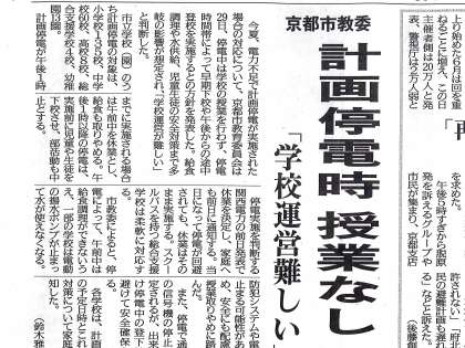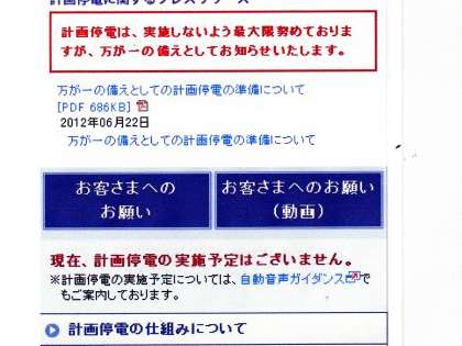 今日7月2日から9月7日まで計画停電の対象期間となります。先週6月30日(土)京都新聞朝刊に載ったように計画停電が実施場合された場合は部分休業の措置をとります。詳細は学校から配布したプリントに記載しています。措置を取る場合は関西電力のホームページから発信される情報が第1次情報ですのでその情報を基本としています。関西電力のホームページについては画像(上)のようにパソコンやスマートフォン、携帯電話から入手できますのでご家庭に置かれても情報入手に努めていただければ有り難いと思います。