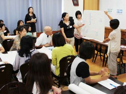 昨日の3日(月)に「第2回中P連西京支部指導者研修会」を西陵中学校で開催しました。研修で行ったのは「ほっこり子育て講座」です。進行役を樫原中学校PTAの松島季代子氏にしていただきました。テーマは「見守る」。5人ごとのグループになって「一人ひとりが主役」「ここだけのはなし」「お互いの意見を尊重すること」を話し合いの原則にして進められました。5つのグループに別れ自分の子どもの心配な事、気になる事を出しあい、その解決策まで協議して模造紙にまとめグループごとに発表されました。話し合い活動や発表された考えや意見の中に自分自身の子育ての考え方と異なる点があったのではないでしょうか。180度違う考え方にはなかなか同調できない部分がありますが、90度あたりの違いなら参考になったりする部分があります。テーマの「見守る」という子育てはその90度の範囲にある考え方として参考になる参加者がおられたのではないかと思います。参加者から「楽しく、有意義だった。また参加したい」という声をいただき、企画サイドとして嬉しく聞きました。