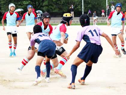 ラグビー部の夏季大会が8日(土)に吉祥院グランドで始まりました。初戦の対戦相手は下鴨中学校。前半で7トライ4ゴールで43−0で折り返し、後半に1トライを許したもの11トライ7ゴールの69−5で勝利しました。試合内容もパスが通り、随所のパントキックでエリアを奪うことも効果的で連覇にむけて視界良好の試合運びでした。