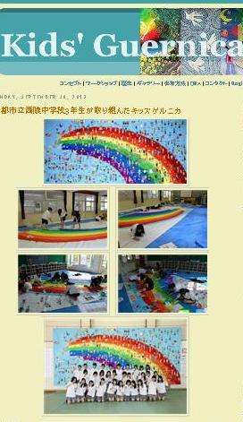 「京都市立西陵中学校の3年生が取り組んだキッズゲルニカが完成しました。作品は9月25日の学校祭で展示し,大盛況を得ました。今年度の学校祭のテーマは『絆』でした。本校の3年生の31人は,このキッズゲルニカを通して,国境を越えて世界の人々と『絆』を結び,世界平和が実現してほしいという思いをこの作品に込めました。この作品の「青空」は国境を越えて彼方へ続くことを連想し,「虹の架け橋」は人と人の思いがつながるを連想し,たくさんの「子供の笑顔」は平和の象徴を連想しています。いろんな顔かたちや服装,描き手の個性などに生き生きとした生徒の姿を感じていただけると嬉しいです。生徒たちは,7月から構想を練り,夏休みも返上で連日の制作に取り組みました。このキッズゲルニカを通して,生徒たちの『絆』もより深いものになったと思います。」