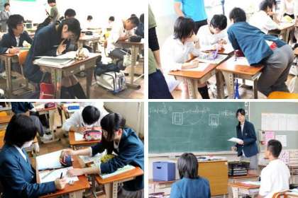 27日(月)から第2回G−学習協同開発授業研究週間に入りました。28日に多田先生(数学科)が3年1組で展開の単元のなかで道の面積を考える授業を行いました。道の面積を出す4つの方法をじっくりと個人で考えたうえでグループ学習に入っていました。黒板で4つの方法の考え方、求め方について発表しどの方法でも同じ面積になることを確認して授業が終わりました。指導助言に石居主事に来校いただきました。