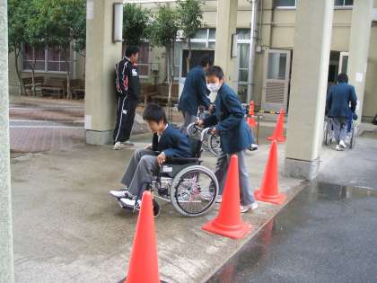 12月が人権月間であることに因んで、今月は人権について考える取組を各学年で進めます。1年生では、身体の不自由な方々が普段どのように生活されているのかを体験し、その思いを共有して自らができることを考えることを中心に取り組ます。その始めとして、車いすを使用している方や目が不自由な方の日常の一部分を知るために、アイマスク、車いす体験をしました。生徒は何に気づき、何を感じ、何を思い考えたでしょうか?