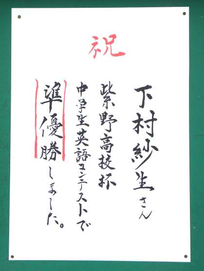 先日、下村さんが「紫野高校杯 中学生 英語スピーチコンテスト」の本選に選出された事を紹介しましたが、12月4日に行われた本選では見事に準優勝と輝かしい成績を収めました。下村紗生さんは10番目の発表者で、とても表現力豊かに熱のこもった迫力のある英語の暗誦を披露してくれました。多くの緊張やプレッシャーにも負けず、日頃の練習の成果をだしきってくれたのだと思います。11月30日の全校集会での生徒全員からの激励の拍手が届いたのでしょうか。しかしナント言っても本人の目標に向けての努力と周りの支えがあってのことだと思います。「念ずれば通じる」という言葉がありますが、下村さんはそれを実証してくれました。誰もが、夢、目標を抱いていると思います。その実現に一所懸命であって欲しいと思います。