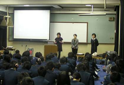 14日の6限に3年生は「性」についての学習しました。京都民医連中央病院から3名の助産師さん(川原さん、福島さん、橘高さん)をむかえ「病院へ行こう!!1人で悩まないで」というタイトルで講演を聴きました。これまでに病院の方の話を聴く機会というのは一度もなかった生徒も多く「愛」と「性」について「妊娠や出産」について「避妊」や「性感染症」についてなどの話を真剣に聴いていました。また、お母さんのおなかの中の赤ちゃんの写真なども見せてもらい、心音(来校が予定されていた妊娠中の助産師さんが急遽入院されたため録音でしたが)などを聴く事もできました。事後のアンケートにも「性に関して悩みがあったり困ったときは病院へ行こうと思います」という感想もありました。とてもいい学習になったと思います。