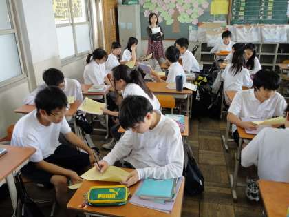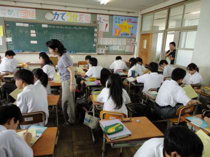 20日の2限には英語科の藤庭先生が1−1にて研究授業を行いました。疑問形の文章を自分で作り,相手に答えてもらうことをグループで学習。1年生らしく大変活気のある授業でした。