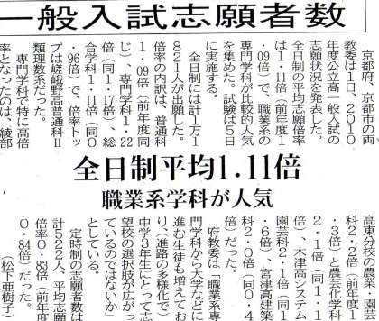今日の京都新聞に「10年度府公立高一般入試志願者数」という見出しで京都府、京都市の全日制普通科、全日制専門学科、全日制総合学科、定時制の志願状況が発表されました。各校の類・類型別、学科別に志願状況が掲載されています。志願者にとっては大変きになるデータではありますが、その数字に惑わされることなく、残りの3日間を全力投球、一所懸命に勉強してほしいと思います。キム・ヨナ選手ではないですが「人事を尽くして天命を俟つ」で臨んでほしいものです。