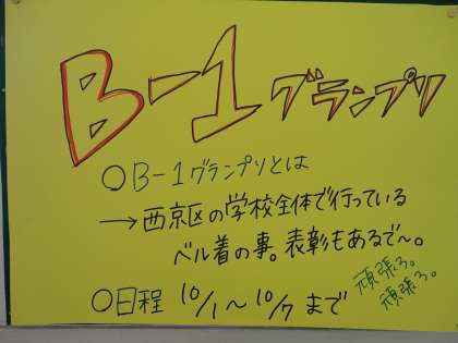 10月1日(水)〜7日(火)までB−1グランプリが行われます。B−1グランプリとは夏休みに実施された中学生会議における西京支部で考えた,西京の中学校共通の取組の一つです。B−1のBはベル着のB。授業がスムーズに開始できるよう,チャイムが鳴るまでに自分の席に座っていようというものです。それとともに毎朝おはよう運動も行っています。西陵祭も終了し,定期テストに向けて規律正しい学習習慣を身につけていきましょう。あいさつは大きな声で元気よく!