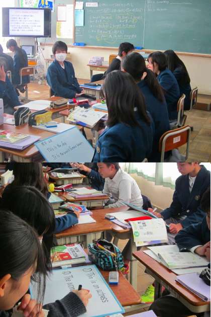 英語(3−4仲田先生)と数学(2−2稗田先生)のG学習を行いました。英語での学習の目標は,接触節を用いた文章でクイズをつくるという内容でした。授業の初めはICTを用いながら接触節のパターンプラックティスを口頭で行い,その後ホワイトボードを用いてペアーで協力しながらクイズを作りました。授業の最後では自分たちの作ったクイズを発表し他のグループが答えを言い合うという形でした。今後学習をしていく関係代名詞の導入となる学習なのでしっかりと覚えておいてください。
