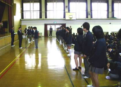 16日(金)6限に認証式を行いました。評議員・環境委員・文芸委員・体育委員・図書委員の代表者に認証書を渡しました。その認証書を渡す際に「お願いします」と一人ひとりに声をかけました。これから始まる各委員会の活動や学校行事を進めるうえで委員の皆さんのリーダーシップは欠かせません。そのリーダーシップを発揮して是非盛り上がりのある活動をお願いしたいという思いを込めました。また、各委員を選んだ人たちの協力がなければ活動や行事は成功しません。全校一体となって「正しく、仲良く、逞しく」にむけた取り組みを進めてほしいと思います。