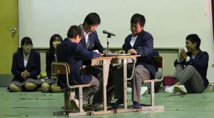 オープニングはこの前終わったお昼の長寿番組の名物司会者を模した、生徒会長が歌いながら登場しました。さらにたたみかけるように、今をときめくサングラスをかけたリズミカルなネタが持ち味の芸人のマネで盛り上げてくれました。