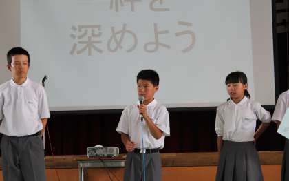 写真は司会と生徒会長の演説と1年生の学級目標の発表の様子です。