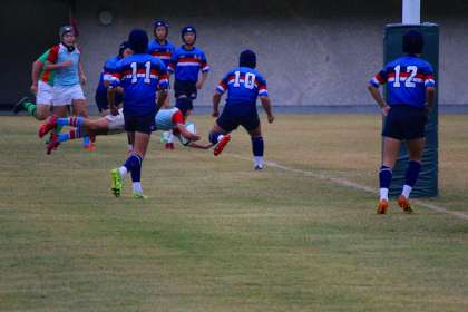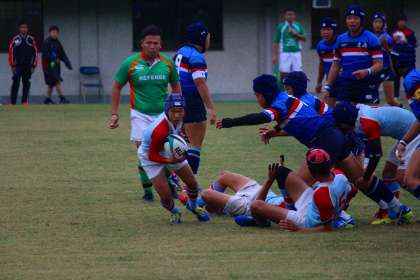 全国3位の強豪校相手に互角の立ち上がり,しかし,相手に先制トライをされ,ゴールも決められる。
