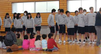 本日家庭科の授業の一環として、3−1の生徒たちが福西保育園の園児たちとふれあい体験を行いました。