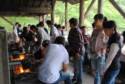 本日2年生は,校外学習として亀岡にある「ふれあいの里 七谷川野外活動センター」に飯盒炊飯に行ってきました。天気予報では,雨となっていましたが学年のパワーのおかげで天候に恵まれ,自然豊かな中でお互い協力し合い,飯盒炊飯で作ったとは思えないとてもすてきな料理が出来上がりました。今回の飯盒炊飯は,料理コンテストも兼ねており,決められた基本食材に各班独自の食材や調味料を加え競い合いをしました。事前にインターネット等でレシピから調理方法まで調べ,普段料理にあまり関心のない子どもたちが夢中になって活動をしていました。