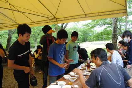 料理対決。審査員にアピールする2組1班のKくん。賞はとれたでしょうか?(審査中の様子)審査の結果,総合優勝は2組。部門賞は,おいしかったで賞(2組2班)。盛り付けが美しかったで賞(2組4班)。アイデア賞(1組1班)。ご飯がススムで賞(1組3班)。ご飯がおいしく炊けたで賞(2組2班)。おしくも賞に選ばれなかった班も協力して素晴らしい料理ができていました。ぜひお家の人に作ってあげてください。