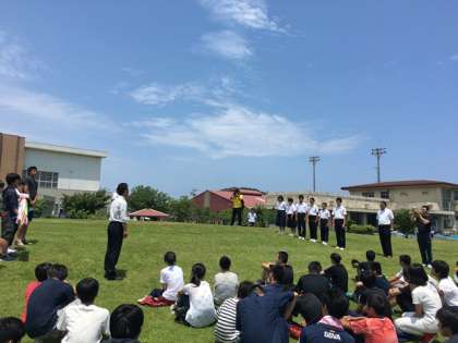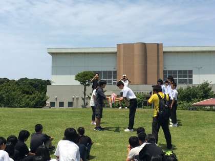 マリン体験学習の前に,平和学習として石田中学校の生徒会本部役員の皆さんと交流をしました。壱岐島は長崎県です。壱岐の小中学校は,同じ原爆により被害を受けた広島県の小中学校と交流をしています。そこで平和を願い西陵中学校の3年生が折った千羽鶴を石田中学校の生徒会長に贈りました。筒城浜には生徒会のみなさんと一緒に校長先生もお越しいただけました。「8月9日の平和集会で,全校生徒にも紹介させて頂きます」と,生徒会長さんから挨拶をいただきました。校長先生からも,平和への願いや人の繋がりを大切にとのお話がありました。