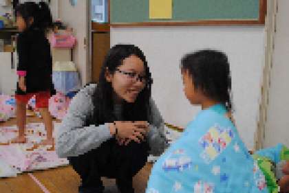 竹の里保育園での活動の様子です。お昼寝の時間が終わったので,順に子どもたちを起こしています。ぐっすり寝ている園児たちに声をかけてまわり起きてもらうことができました。お昼寝の後は,おやつの時間でした。おやつの準備を一緒に行い,いただきました。