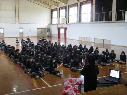 11月9日底冷えのする体育館で、助産師会から講師の先生をお招きし、性に関する講義を行ってもらいました。お話しは、出産・中絶の問題から虐待や今後如何に生きるべきかという人生の教訓に至るまで、豊富な内容でした。寒い中、笑いのこぼれる瞬間もありましたが、生徒たちは真剣に話を聴いており、これからの長い人生における生き方の一助になったことでしょう。